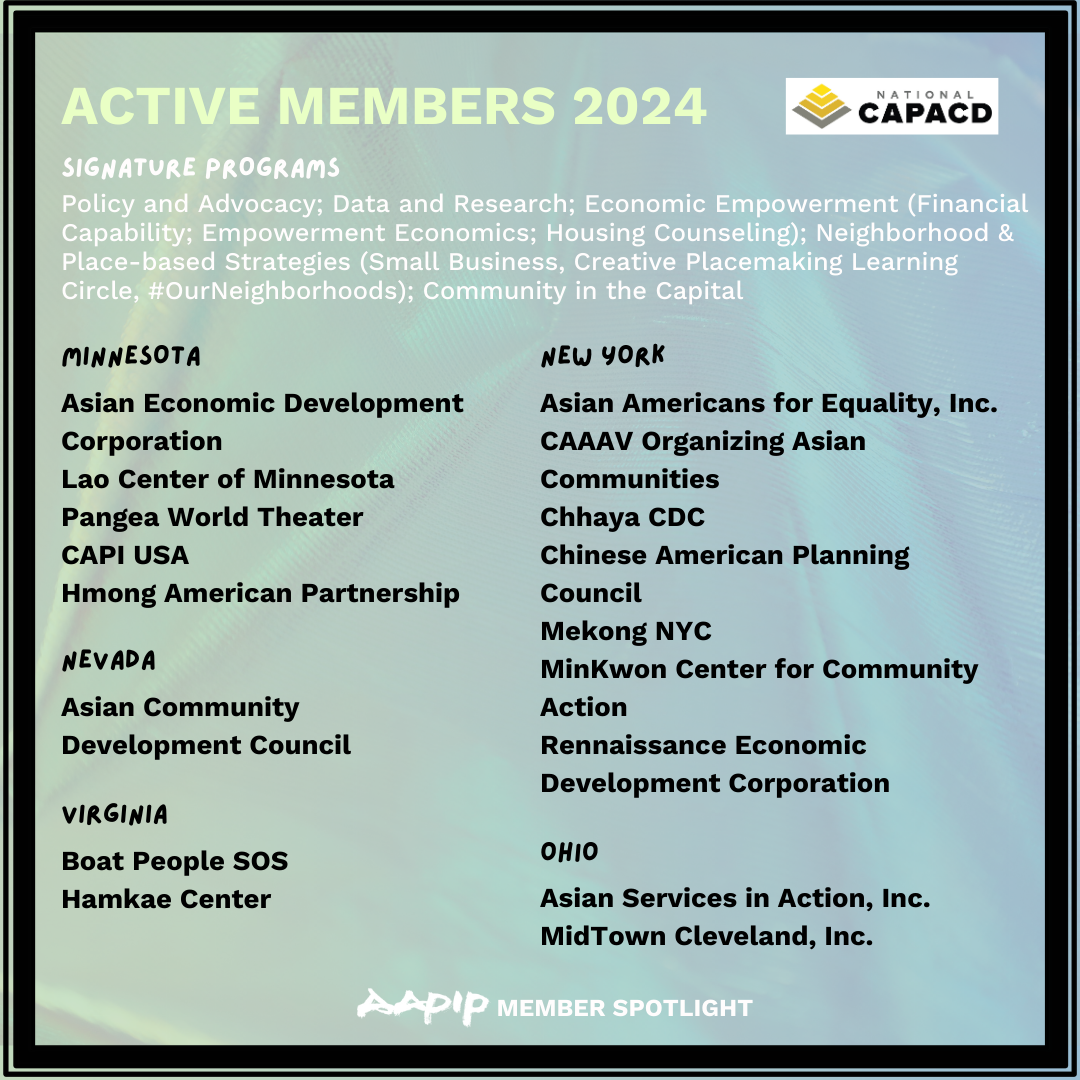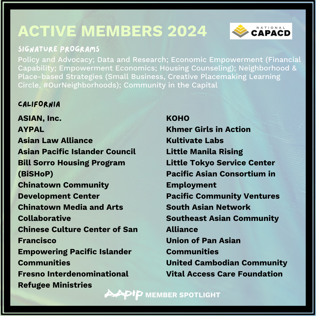 National CAPACD advances equity and creates vibrant, healthy neighborhoods by mobilizing and strengthening a powerful coalition of Asian American, Native Hawaiian, and Pacific Islander community-based organizations working in low-income communities. They are a coalition of nearly 100 community-based organizations spanning 21 states and the Pacific Islands.