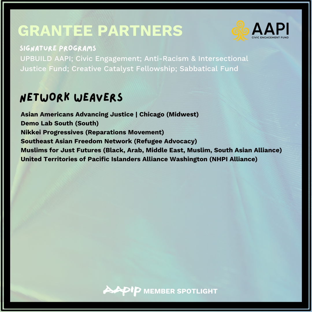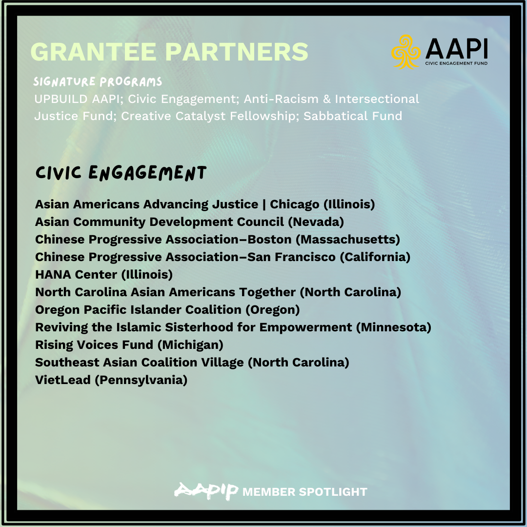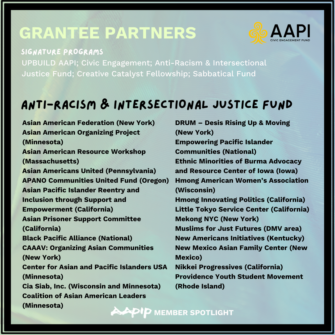 As the progressive home to AANHPIs in philanthropy, AAPIP’s work is empowered by a 150+ membership network of private, family, community, and corporate foundations, grantmaking networks, individual staff of grantmaking organizations, and other philanthropic institutions. Of our institutional members, we are honored to uplift the AANHPI-specific member organizations and their grantee partners who together embody the deeper commitment to dedicating philanthropic support to our communities, led by our communities.