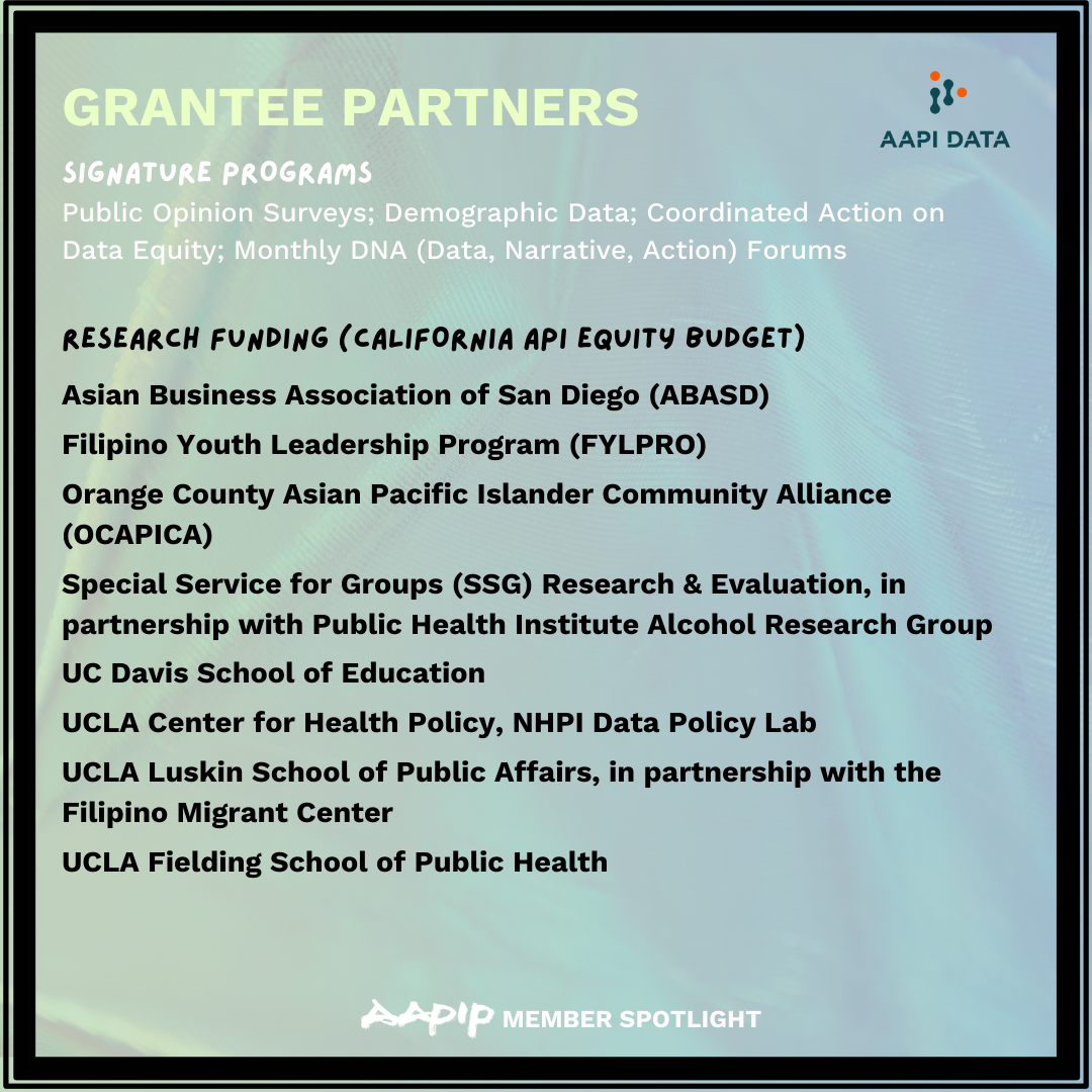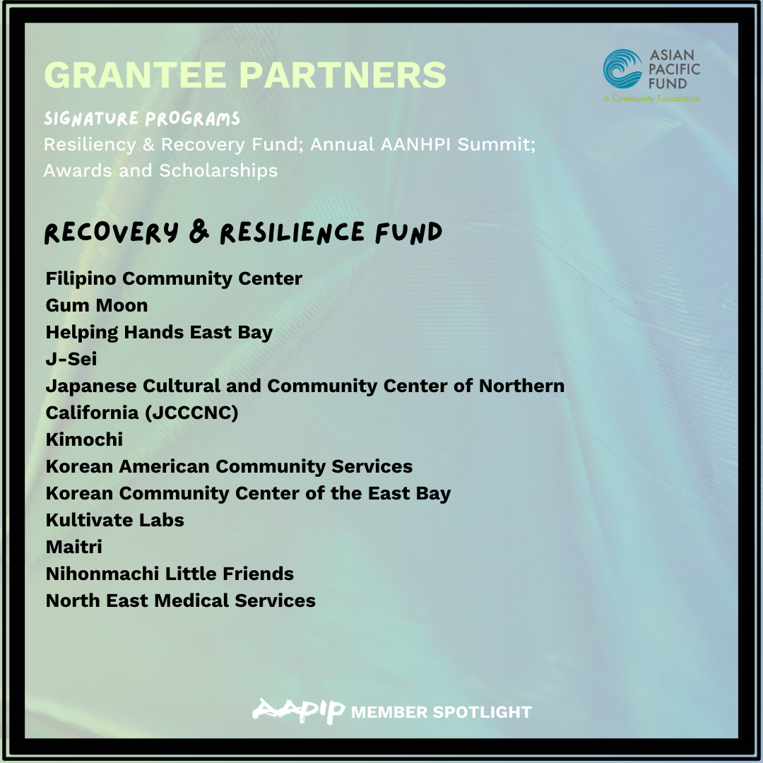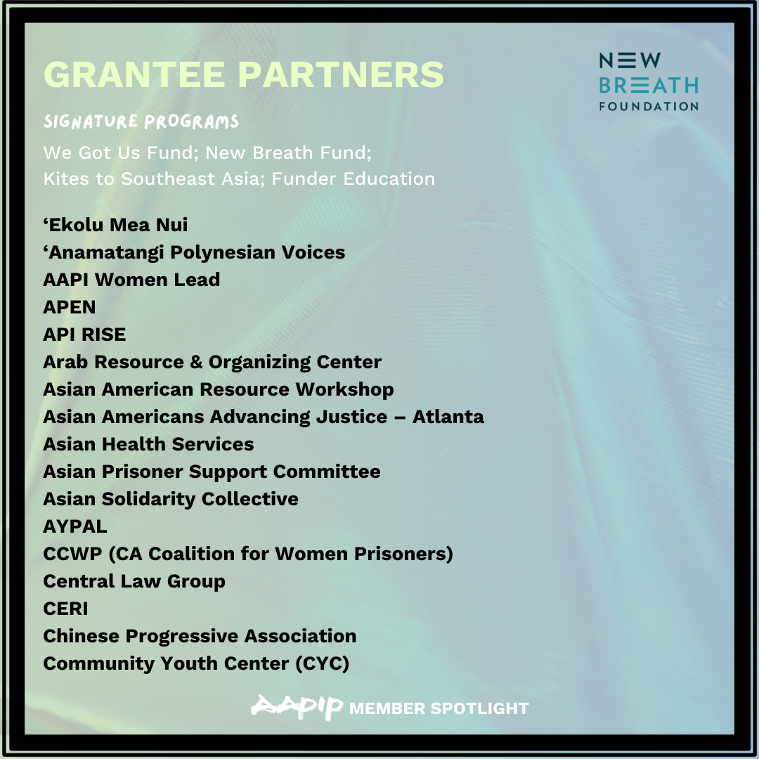 As the progressive home to AANHPIs in philanthropy, AAPIP’s work is empowered by a 150+ membership network of private, family, community, and corporate foundations, grantmaking networks, individual staff of grantmaking organizations, and other philanthropic institutions. Of our institutional members, we are honored to uplift the AANHPI-specific member organizations and their grantee partners who together embody the deeper commitment to dedicating philanthropic support to our communities, led by our communities.