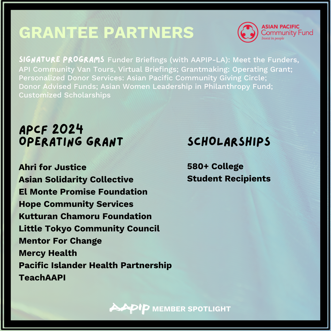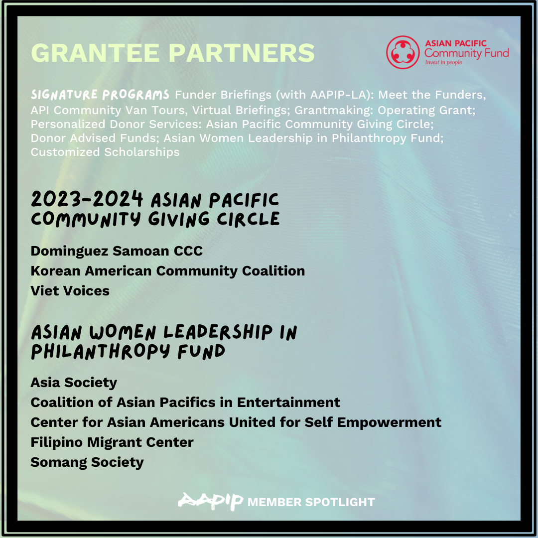 Signature Programs: Funder Briefings (with AAPIP-LA): Meet the Funders, API Community Van Tours, Virtual Briefings; Grantmaking: Operating Grant; Personalized Donor Services: Asian Pacific Community Giving Circle; Donor Advised Funds; Customized Scholarships; Asian Women Leadership in Philanthropy Fund