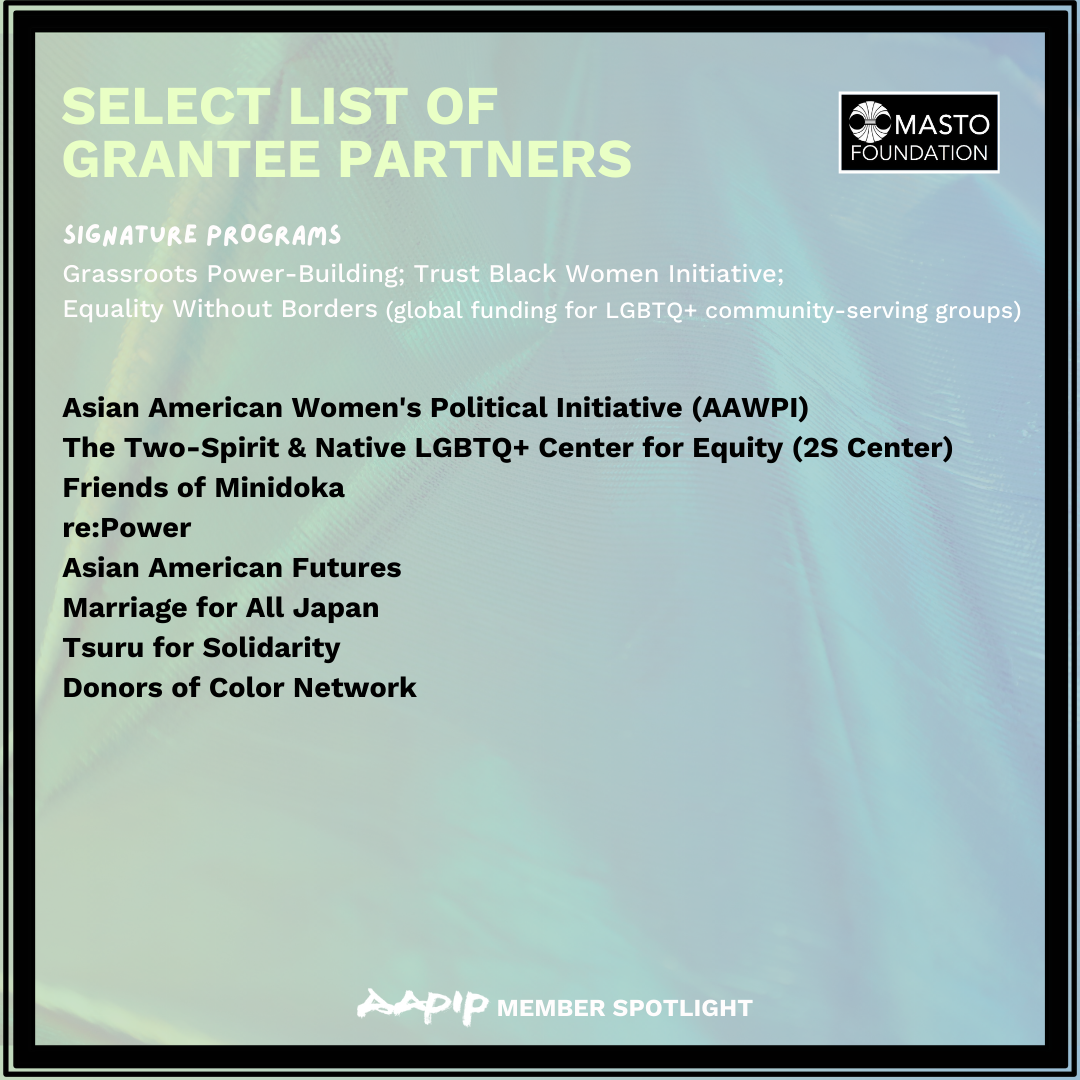 Masto Foundation is a Japanese-American family foundation rooted in the Japanese-American community and committed to promoting diversity, equity, and justice by investing in grassroots social change. The Foundation gives resources to support marginalized communities, particularly those who have or are currently experiencing systemic institutionalized discrimination, to build leadership, power, and strength.