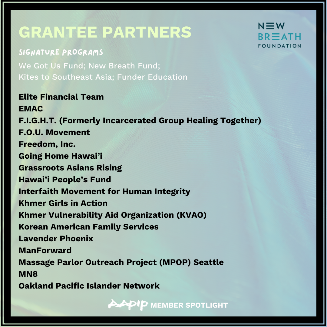 New Breath Foundation delivers critical, under-resourced, frontline groups the resources they need to help empower, heal, and change AANHPI’s lives in real time. They’re leading the movement to fund grassroots groups that transform AANHPI’s lives here and now while fighting for the collective liberation of all people of color.