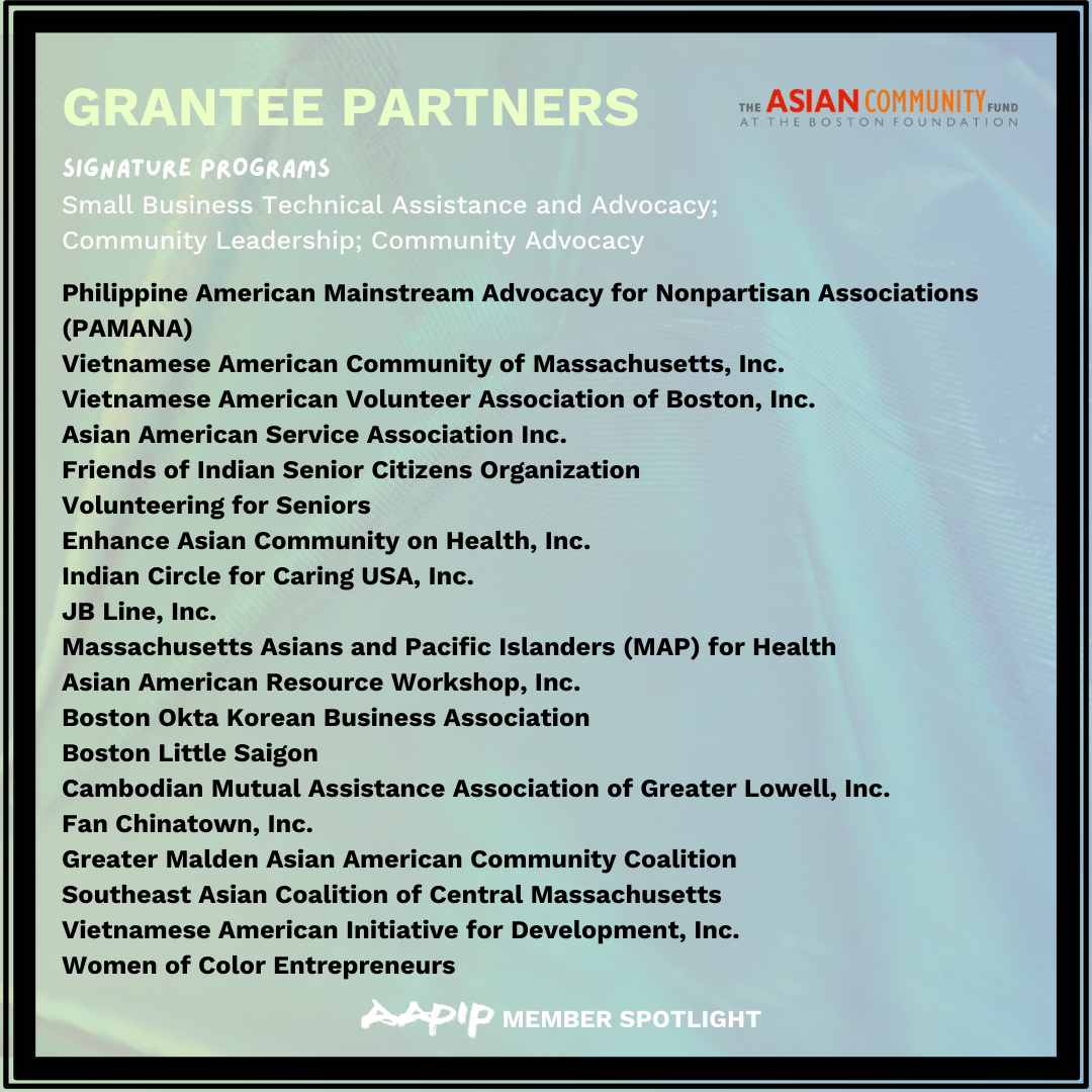 The Asian Community Fund at the Boston Foundation is a permanent resource designed to develop, strengthen and support Asian American and Pacific Islander (AAPI) community power in Massachusetts, to galvanize and unite the diverse ethnicities within this community, and to build a stronger advocacy voice.