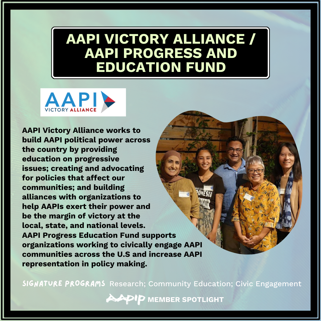 AAPI Victory Alliance works to build Asian American and Pacific Islander (AAPI) political power across the country by providing education on progressive issues; creating and advocating for policies that affect our communities; and building alliances with organizations to help AAPIs exert their power and be the margin of victory at the local, state, and national levels. AAPI Progress Education Fund supports organizations working to civically engage AAPI communities across the U.S and increase AAPI representation in policy making.